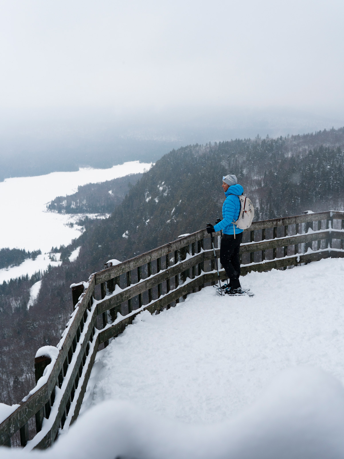 Si tu as un peu plus de temps, le sentier de La Corniche (6,8 km aller-retour) mène à un point de vue différent, mais tout aussi impressionnant sur le lac Monroe. J’avais fait ce sentier à l’automne et c’était vraiment beau, et j’imagine qu’en hiver, le décor doit être tout aussi magnifique!